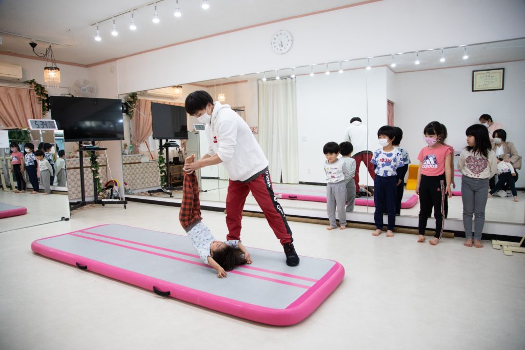 前転やプリッジ、側転をはじめバック転や宙返りなど習得したい技を指導します。段階的に必要な動作・感覚を身につけながら一人一人丁寧な補助、アドバイスで技能を高めていきましよう。